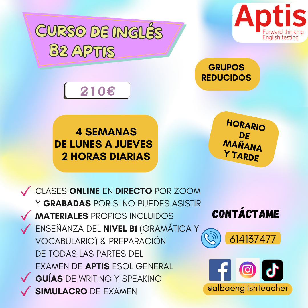 👩🏫 En grupos reducidos, online por Zoom, preparamos el examen de Aptis explicando la gramática y el vocabulario necesarios para el nivel B2, con un documento exclusivo de casi 200 páginas.